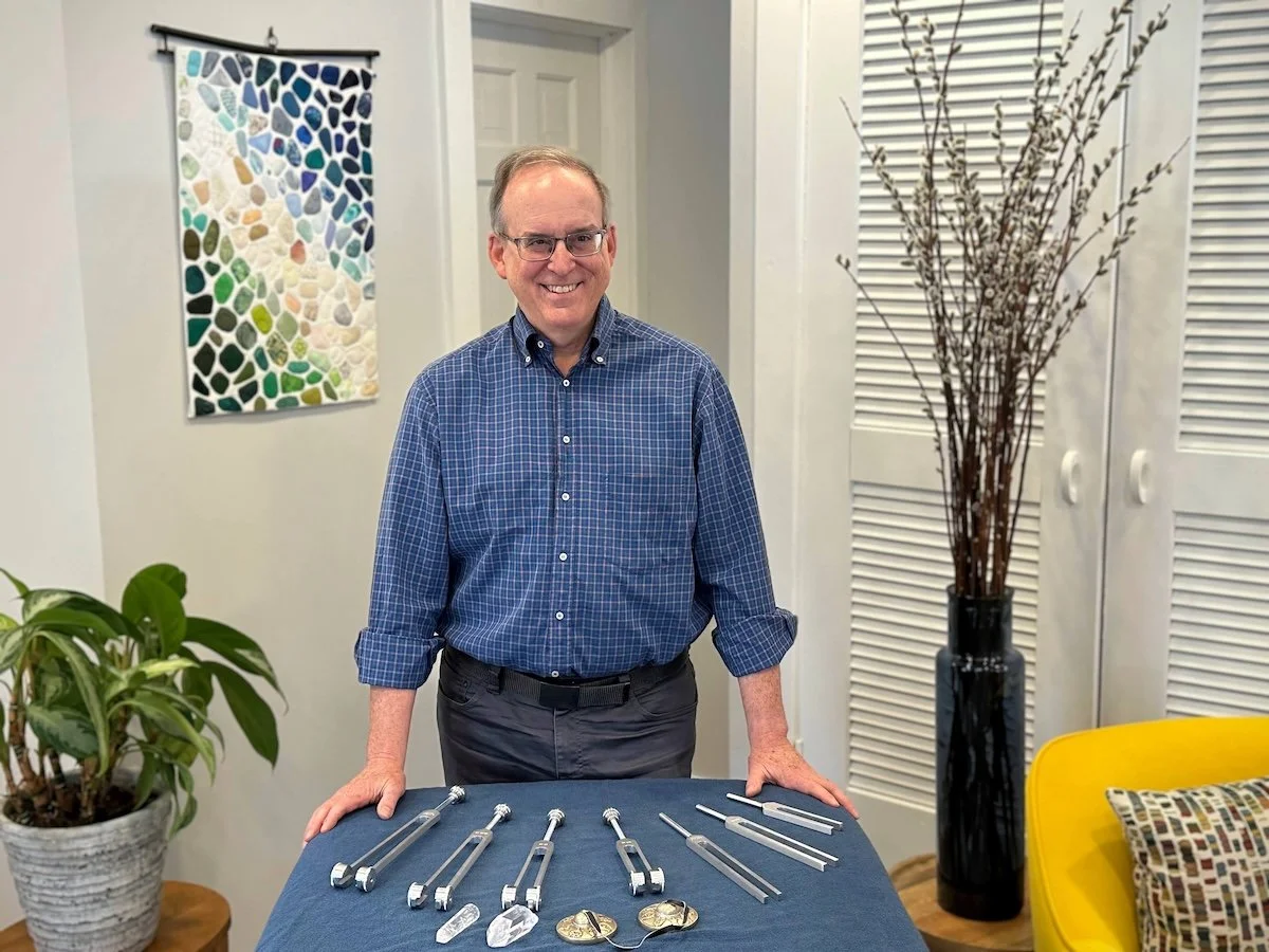 Tom Melcher, Biofield Tuner, offers a gentle, sound-based approach to releasing stress, tension, and emotional weight. Using tuning forks in the body’s energy field, Biofield Tuning supports balance and the body’s natural ability to self-regulate. Tom brings decades of professional experience and a strong educational background to his work, grounding his practice in steadiness and care.